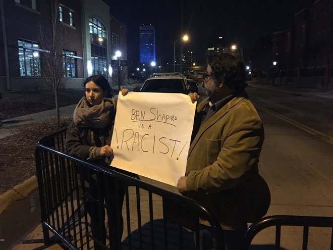 I was ready to grab tickets once they became available, and then I showed up a couple hours before the doors opened to get a good seat inside (along with a a few dozen of other people). We arrived just as a busload of security personnel showed up to secure the event. There were also officers stationed on rooftops and on horseback, while several others with full riot gear assembled, looking prepared for trouble. It was truly bizarre, particularly since only TWO protesters showed up — with a single sign to share between them.